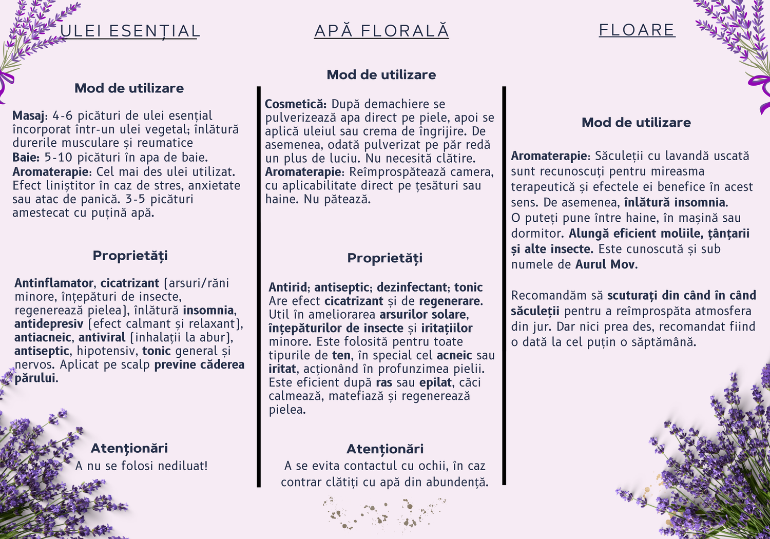 Aici se gasesc cateva dintre utilizarile si proprietatile uleiului esential, ale apei florale si a florii lavandei.